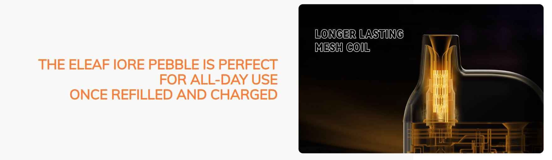 Με τη χωρητικότητα των 6,5 ml και το αντίσταση Mesh μεγάλης διάρκειας, το Iore Pebble Pod θα διαρκέσει όλη μέρα.
