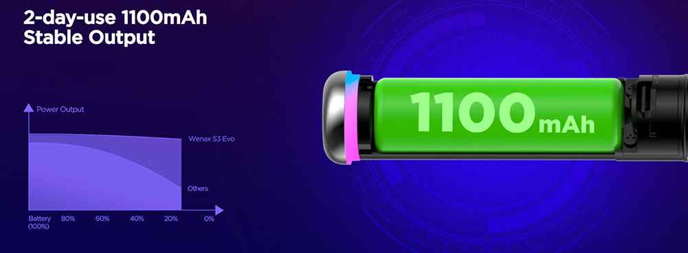 Το S3 Evo παρέχει εκπληκτική αντοχή στη χρήση 2 ημερών και επιτρέπει σταθερή γεύση και σταθερή απόδοση έως και 18 W.