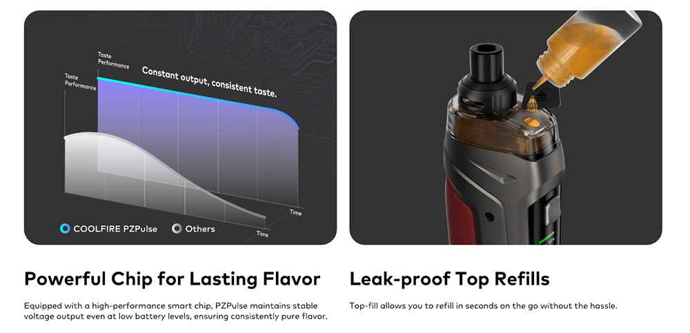 Το Coolfire PZPulse είναι μια συμπαγής συσκευή DTL που συνδυάζει την κομψή σχεδίαση με ένα εξαιρετικά ανθεκτικό σώμα με πιστοποίηση IP68 με τριπλή αντοχή. Ως η πρώτη συσκευή συμβατή με το PZP Max Coil, διαθέτει μπαταρία 2400mAh και μέγιστη ισχύς εξόδου τα 80W.