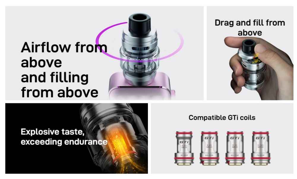 Η αντίσταση GTi ενσωματώνει πλέον την τεχνολογία COREX 2.0, προσφέροντας πλουσιότερη γεύση και πυκνότερη παραγωγή ατμού. Είναι συμβατή με όλη τη σειρά αντιστάσεων GTi, επιτρέποντας προσωποποιημένη εμπειρία DTL για κάθε τύπο ατμιστή.