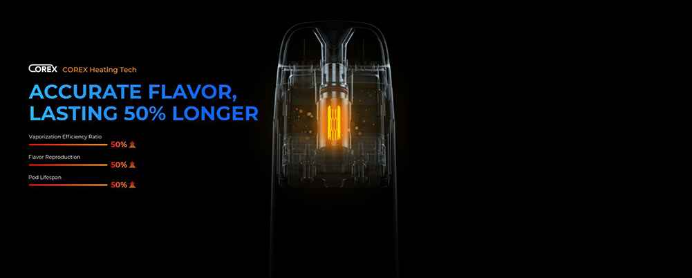 Η μοναδική δομή της αντίστασης Morph-Mesh και το πιο αφράτο βαμβάκι COREX εξασφαλίζουν πιο ομοιόμορφη θέρμανση και ταχύτερη παροχή υγρού. Βελτιώνει την αναλογία απόδοσης για να παρέχει σταθερή γεύση και να παρατείνει τη διάρκεια ζωής της αντίστασης κατά 50%.