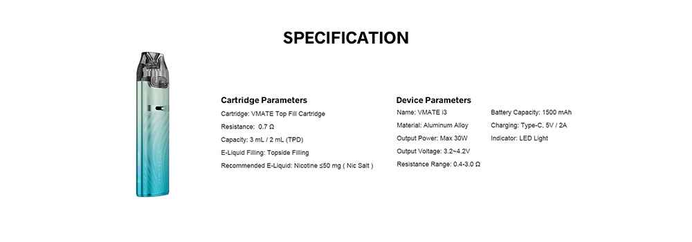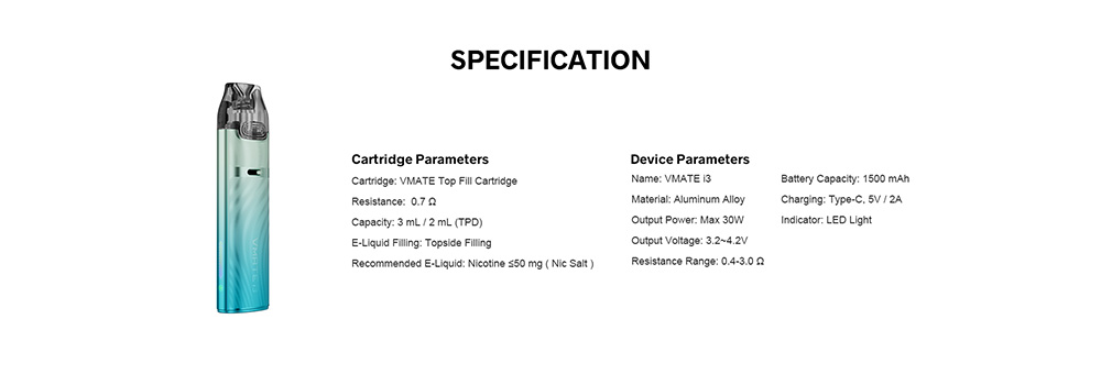 Το VMATE i3 συνδυάζει το εξαιρετικά ελαφρύ σώμα των 49,8 g με μια μεγάλη μπαταρία 1500 mAh, προσφέροντας ταυτόχρονα φορητότητα και διάρκεια. Η αναβαθμισμένη 3X VMATE Top Fill Cartridge προσφέρει τριπλή βελτίωση σε αποτροπή διαρροών, απόδοση γεύσης και ανθεκτικότητα. Σε συνδυασμό με γρήγορη φόρτιση 5V/2A και Neon φως ένδειξης, προσφέρει μια εμπειρία χωρίς έγνοιες σε χρήστες αρχικού επιπέδου που εκτιμούν την οικονομική αποδοτικότητα και την ευκολία.