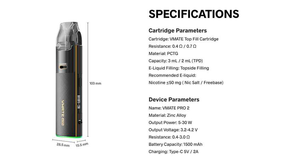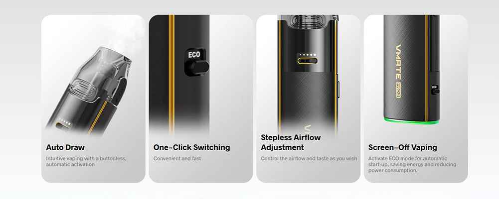 VMATE PRO 2 – Με ολοκαίνουργια λειτουργία ECO, είναι το πρώτο POD με έξυπνη δυναμική ισχύ, σε συνδυασμό με μια μεγάλη μπαταρία 1500 mAh. Εξοικονομεί ενέργεια ενώ παράλληλα προσφέρει μια ικανοποιητική εμπειρία ατμίσματος. Ο σχεδιασμός έχει επίσης αναβαθμιστεί πλήρως για μια εντυπωσιακή εμφάνιση, με 7 μοντέρνες επιλογές χρωμάτων. Νέα εμπειρία, νέος σχεδιασμός – αυτό είναι το ολοκαίνουργιο VMATE PRO 2!