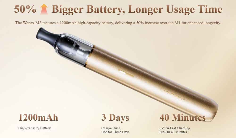 The Wenax M2 features a high-capacity 1200mAh battery, offering 50% more performance than the M1 for improved longevity.