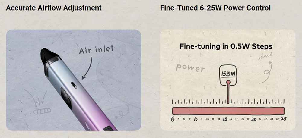 Get optimal power with Trine’s smart pod recognition. From the smooth 0.8Ω pod at 14W to the intense 0.6Ω pod at 25W, enjoy personalized vaping experiences with ease.