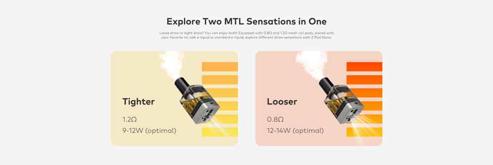 You can enjoy two MTL vaping experiences! Equipped with 0.8Ω and 1.2Ω mesh resistance, combined with your favorite flavor, explore different sensations with the z pod nano.